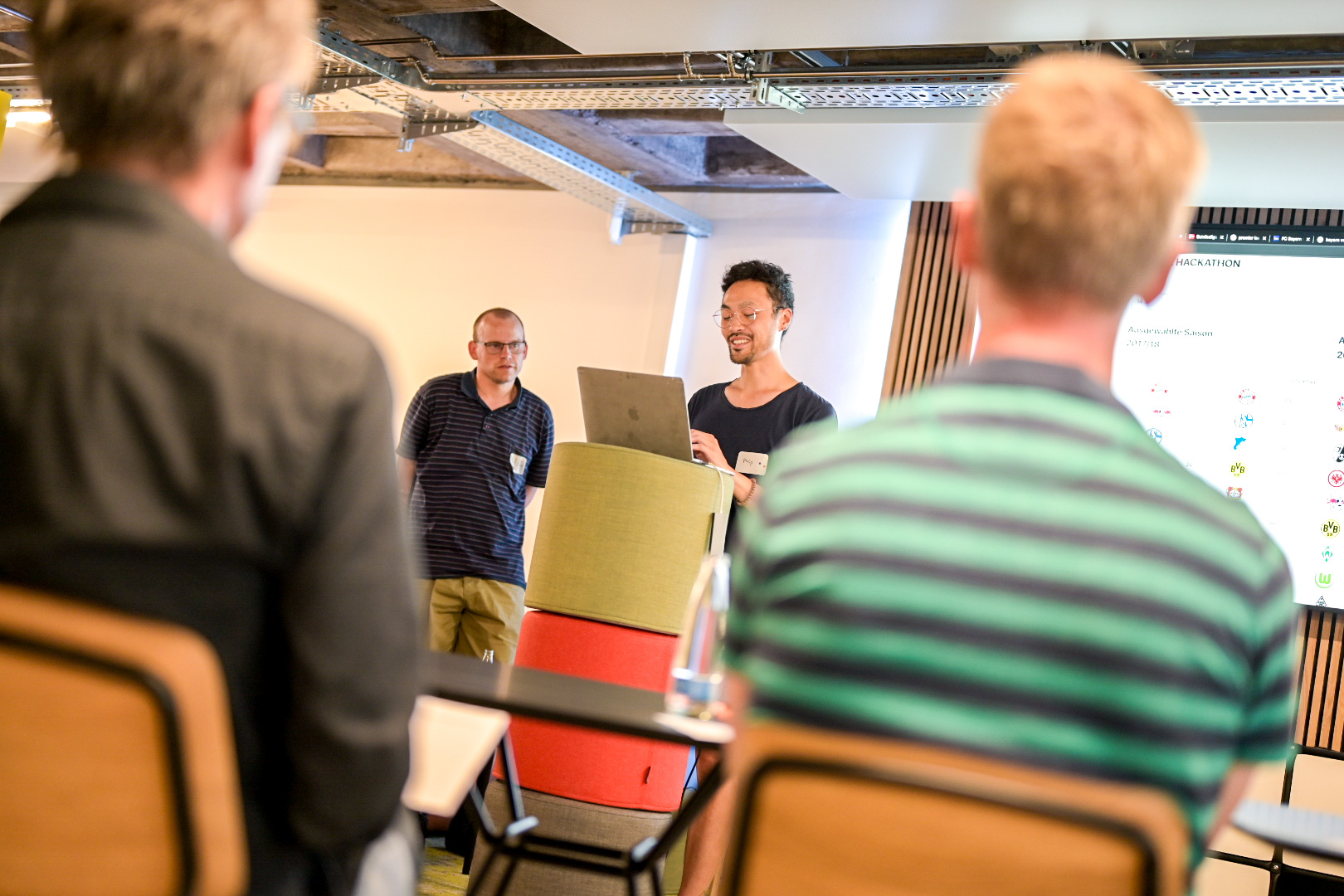 Die Teams zogen sich in verschiedene Ecken im Erdgeschoss unseres Gebäudes in der Flaschenhofstraße zurück und arbeiteten bis 19 Uhr an ihren Ideen. Zwischendurch gab es eine Q&A-Session und Input für den Pitch, denn auf eine Vorstellung der Ideen vor der Jury lief alles hinaus. Die Teilnahme an einem Hackathon erfordert Engagement, Kreativität und eine Menge Kaffee!