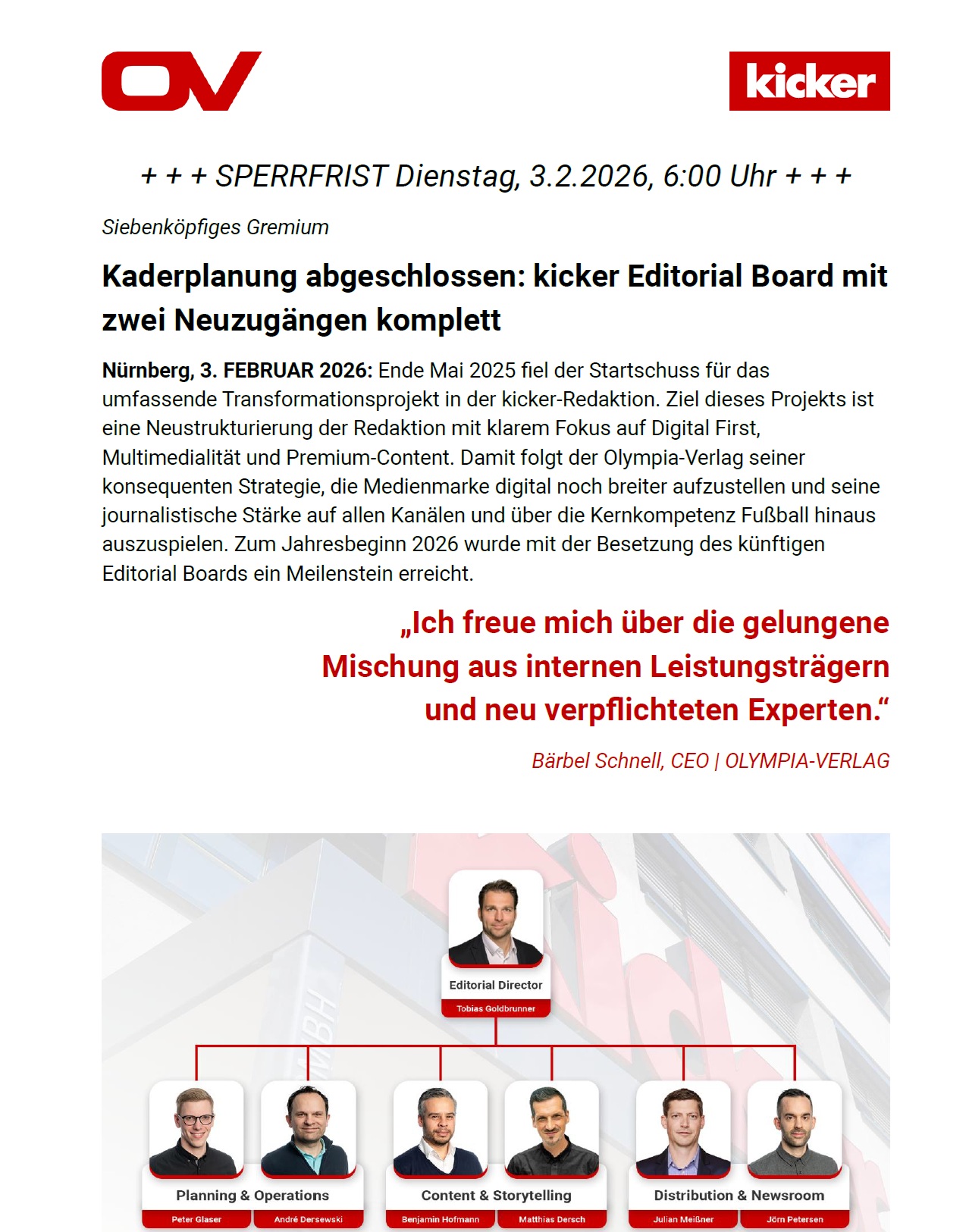 Ende Mai 2025 fiel der Startschuss für das umfassende Transformationsprojekt in der kicker-Redaktion. Ziel dieses Projekts ist eine Neustrukturierung der Redaktion mit klarem Fokus auf Digital First, Multimedialität und Premium-Content. Zum Jahresbeginn 2026 wurde mit der Besetzung des künftigen Editorial Boards ein Meilenstein erreicht.
